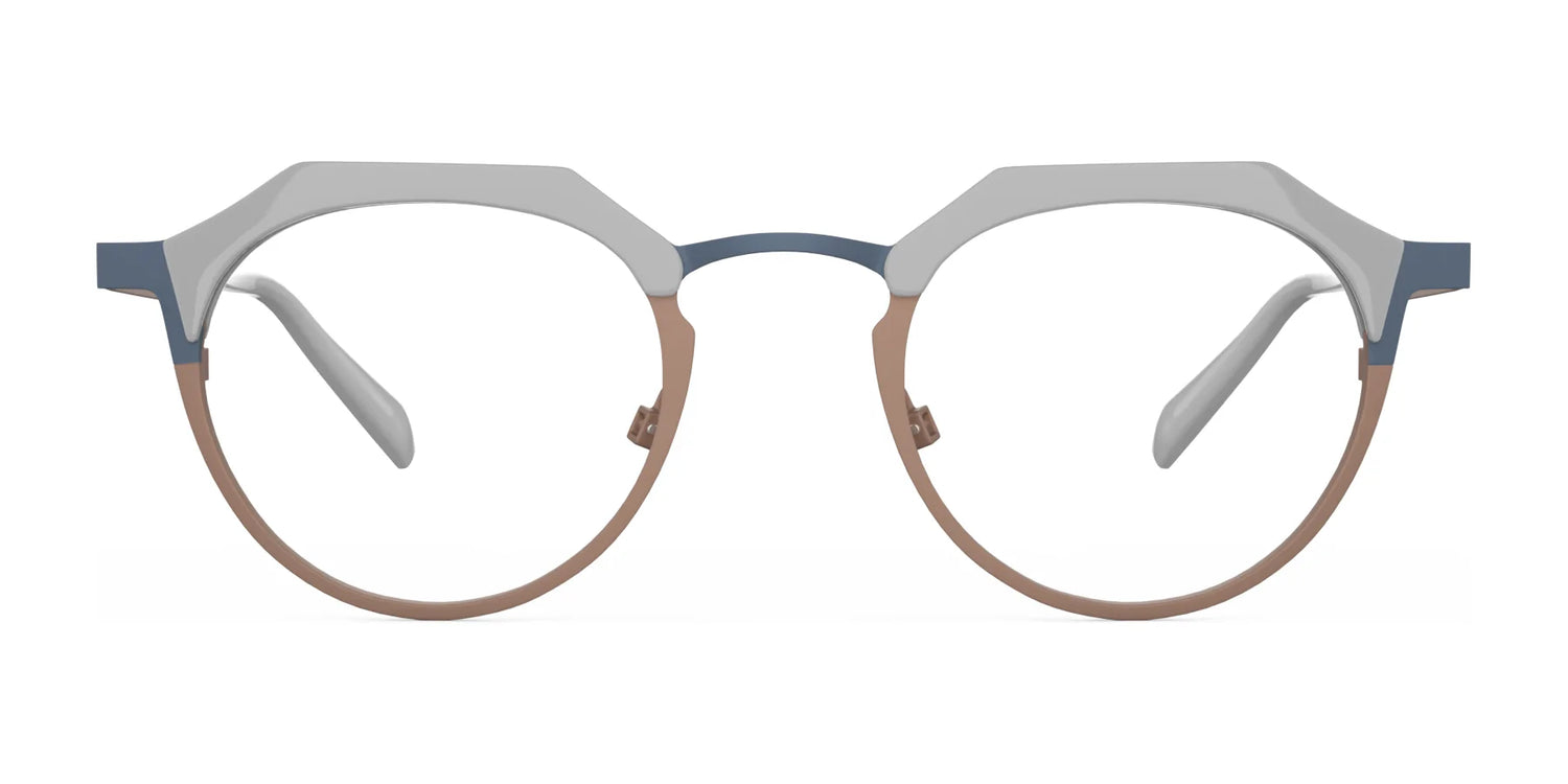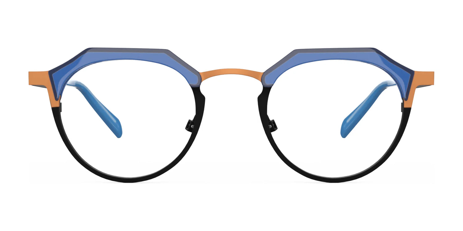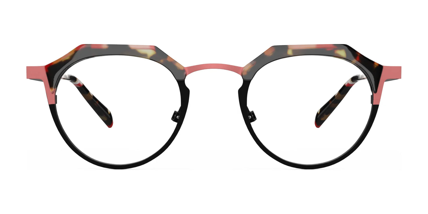 Double the material double the fun! This combinationmetal and acetate frame is a party in a pair of glasses.Round shapes get a funky top with cut outs to accent thesplit colors. Adjustable nose pads make this style equalparts comfortable and fashionable.